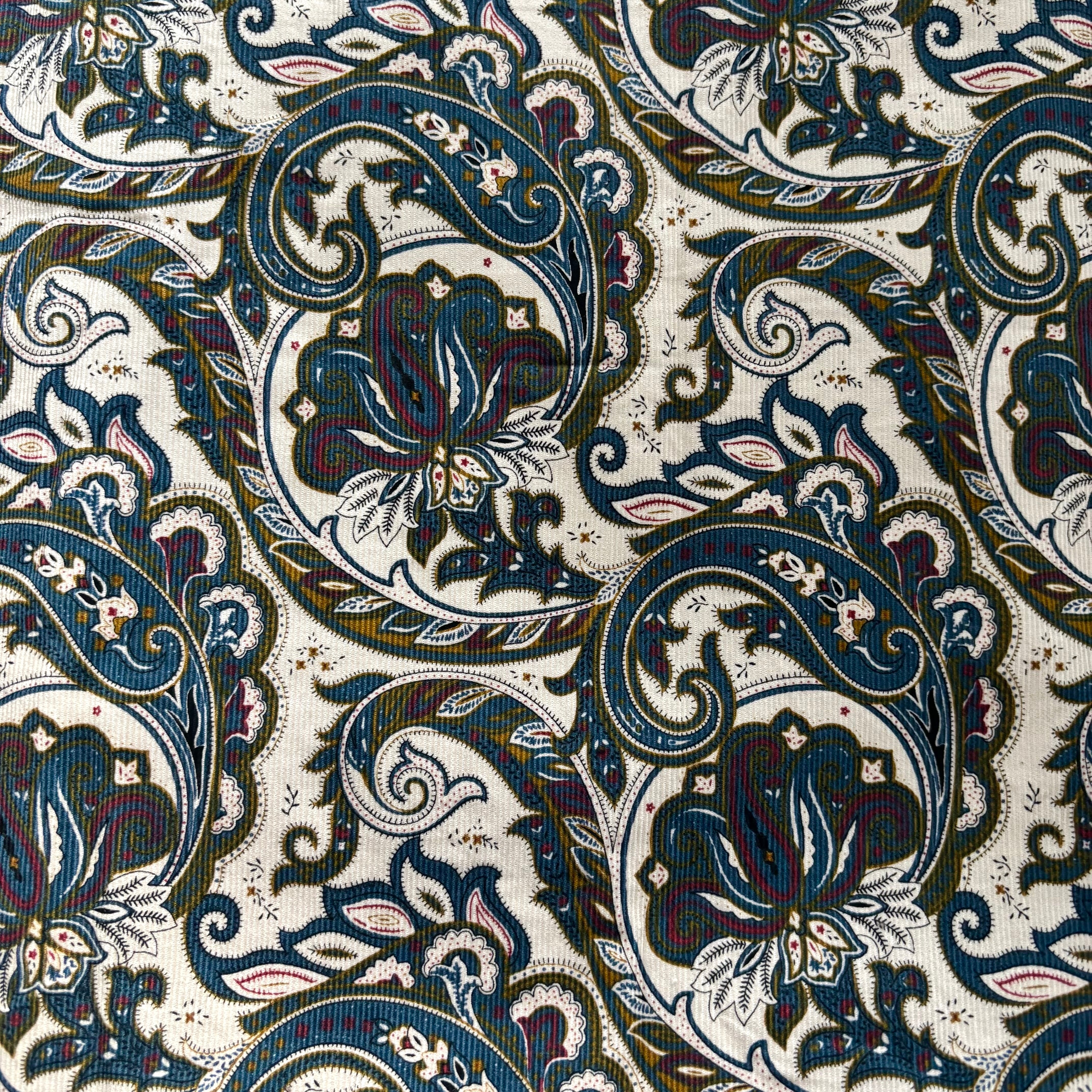インディゴのデニム生地と、1部分にペイズリー柄のシャツコール生地を使った、丸みのあるベレー帽です。